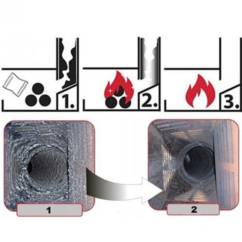 активне очищення (на початковій фазі застосування очищувача сажі) - засипати 2 кг очищаючого засобу в бункер для гранульованого палива опалювального приладу; обслуговування (після активного очищення) - засипати 250 г очищувача в бункер для гранульованого палива опалювального приладу. Повторювати регулярно після спалювання кожних 200 кг палива.